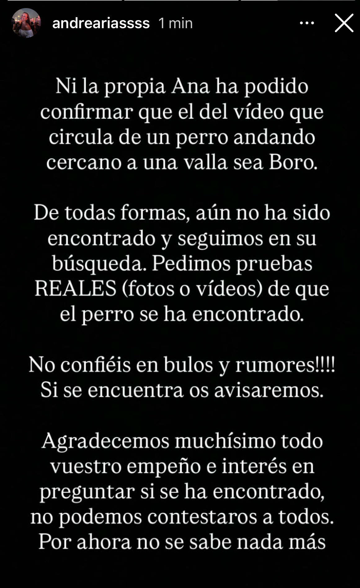 Este es el último mensaje que ha compartido, en la mañana de hoy, una persona cercana a la familia de Boro. Es decir, no está confirmado que ese perrete fuera Boro, aunque evidentemente se parece.